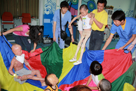 In the summer of 2010, HandReach took a twenty-person team – physical and occupational therapists, psychosocial specialists, musicians, and youth Beat Brigade members – to two cities in China (Changsha and Beijing) to lead camps for burn-injured children and to serve as training models in psychosocial care for clinical pediatric burn staff from around China. Working with several dozen severely-injured children in the two cities, HandReach's team provided a host of therapeutic activities and hands-on clinical training ranging from splint-making to scar management to fostering physical and psychosocial healing goals through exercise, play, and music therapy. The team also donated several thousand dollars' worth of equipment, instruments, and supplies to both hospitals.